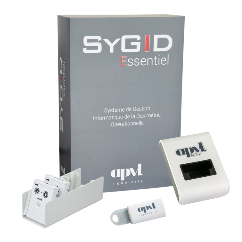 Le pack comprend : un ou plusieurs dosimètres, une borne de lecture ACT-5, le logiciel BORNEO (compatible avec la borne ACT-5, il permet l’attribution et la restitution des dosimètres, ainsi que la visualisation graphique des doses et des pics de débit) et le logiciel SyGID Essentiel (gestion des utilisateurs, des dosimètres, des doses et des alarmes), ainsi qu’un rack de rangement, selon le nombre de dosimètres inclus dans le pack.