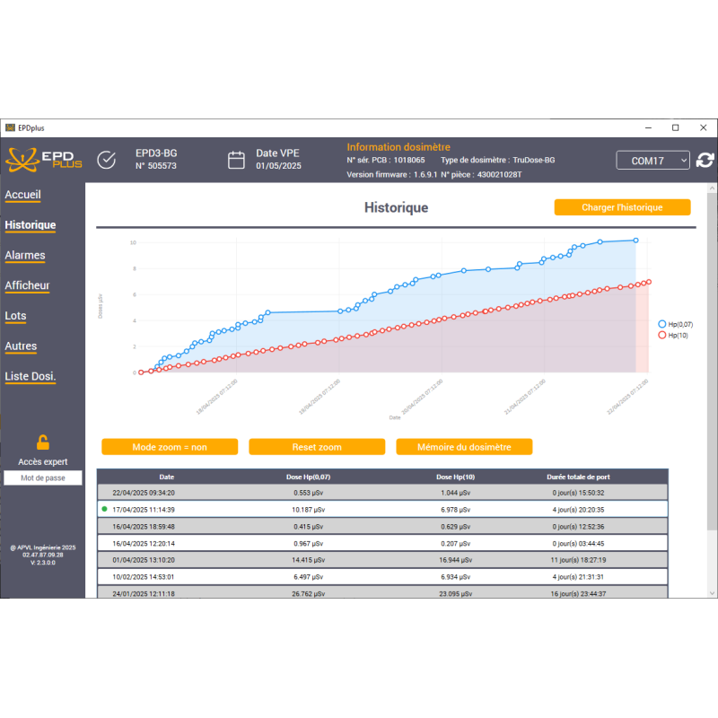 EPDplus est un logiciel de configuration dédié aux dosimètres EPD Mk3 et EPD N3. Rapide à prendre en main, il permet un paramétrage personnalisé des dosimètres selon vos besoins, et offre un accès direct à l’ensemble des données dosimétriques.