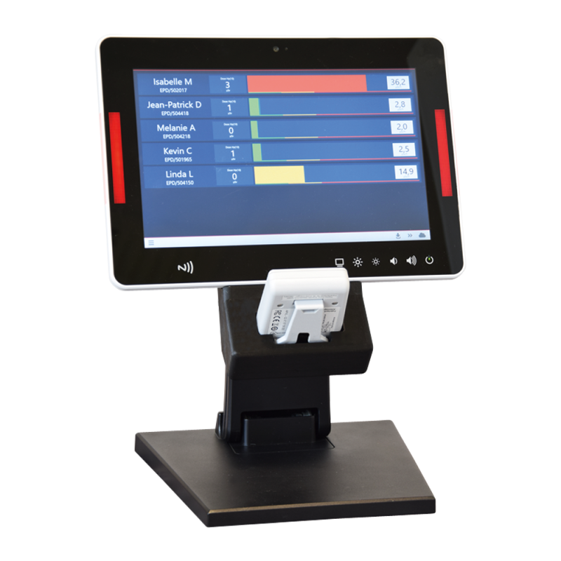 La borne SCT BT est composée d’un écran tactile de 10 pouces, d’un support de table et d’un puits de lecture. Cette configuration de faible encombrement est idéale pour le suivi en temps réel de la dosimétrie des personnes. Elle permet une communication sans fil avec une portée de 10 à 20 m.